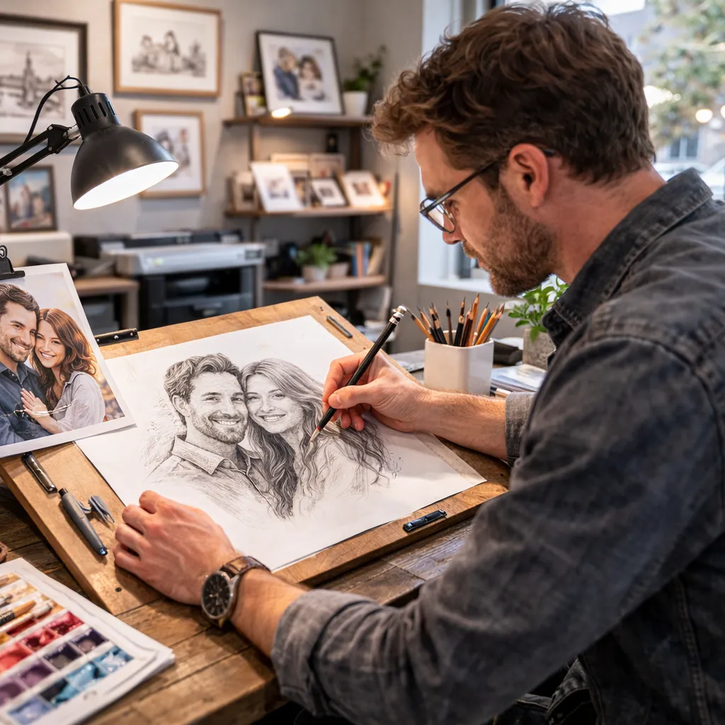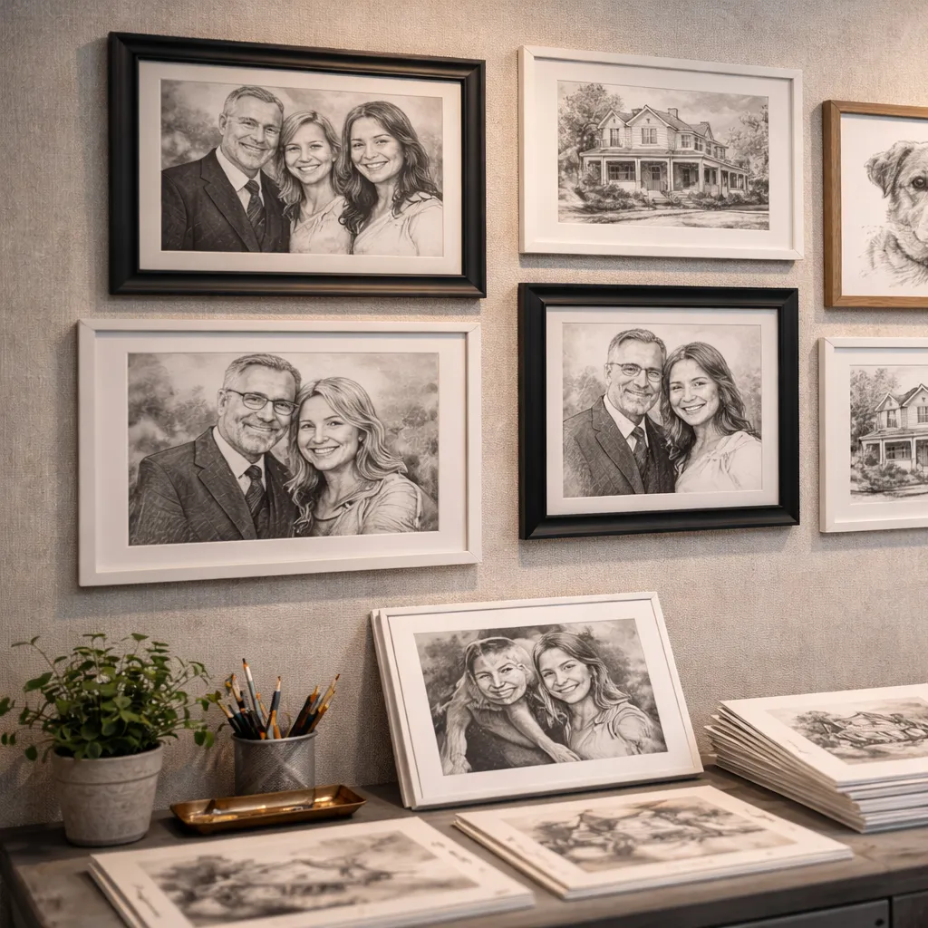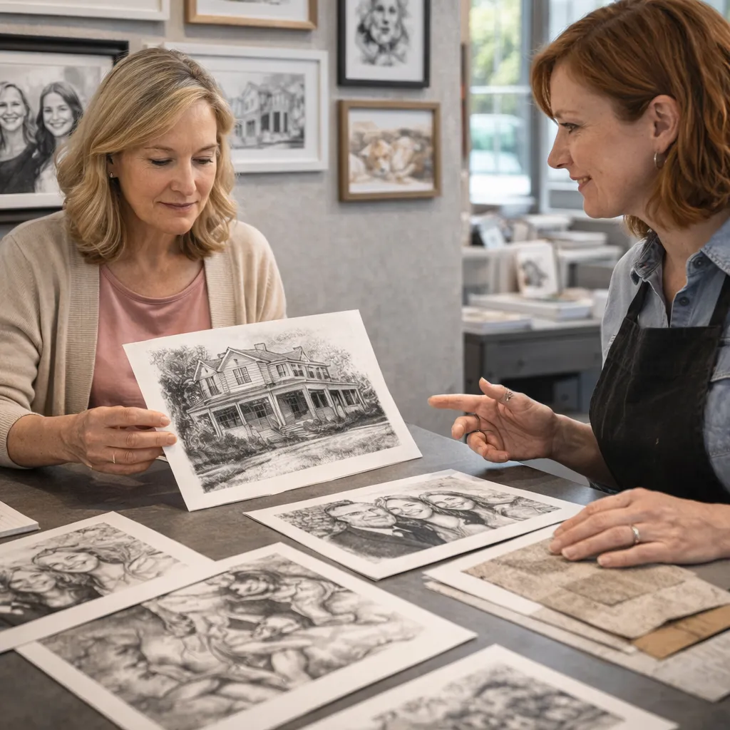 Discuss style preferences (line art, cross-hatching, stippling, etc.), size, and any special requests. We'll provide a detailed quote.