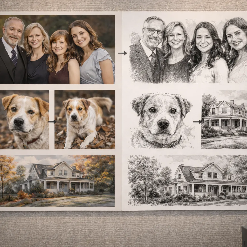 Transform your favorite photographs into stunning black and white illustrations at Rabbit Ship+Print. Our skilled artists hand-draw each piece using professional illustration techniques, capturing the timeless elegance and dramatic contrast that only monochrome art can deliver. From classic portraits and architectural renderings to pet illustrations and special moments, we turn your memories into striking, gallery-worthy artwork.